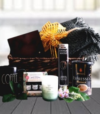 Black Mug White Scented Candle (100 Gr Or 20 Hours) Notebook Wool Blanket (Approximately: 140X205 Cm), Set Of 3 Different Essential Oils Pack Of Gourmet Ground Coffee 200 Gr (Lavazza, Julius Meinl, Illy Preferably In A Tin Box) Box Of Hot Chocolate 120 Gr Gift Wrapped In A Basket With A Bow