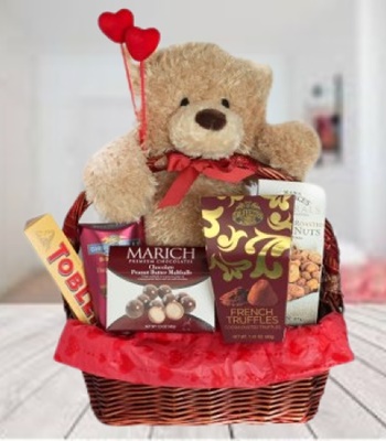 Teddy Bear (Light Brown) 20 Cm Toblerone Chocolate Bar (100 Gr) Small Box Of Chocolates (100 Gr) Box Of Chocolate Truffles (40 Gr) Chocolate Balls Candies (Or Similar) (40 Gr) Mixed Nuts (100 Gr) Gift Wrapped In A Basket With Romantic Decor