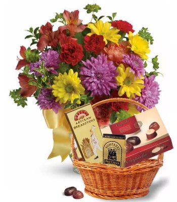 Get everything the heart desires with this thoughtful gift package. Includes a lovely birthday themed mixed bouquet including alstroemeria and daisies, with a small Gift Basket containing three (3) tasty treats. ;