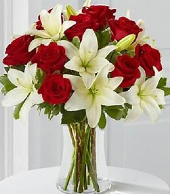 Add some romance with this rich bouquet of luxurious red roses and white lilies.