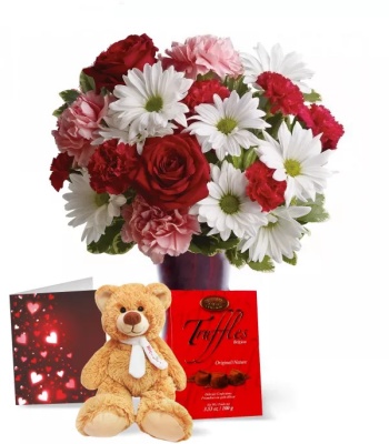 Delight your love with this beautiful bouquet of bright White Chrysanthemums, precious Pink and Red Carnations, romantic Red Roses and accenting greenery. Included in this Special Value package is Bouquet, decadent Truffles, a cuddly Teddy Bear and full size Card. Vase not included - available for purchase at checkout. ;