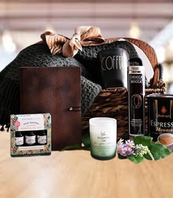 Black Mug White Scented Candle (100 Gr Or 20 Hours) Notebook Wool Blanket (Approximately: 140X205 Cm), Set Of 3 Different Essential Oils Pack Of Gourmet Ground Coffee 200 Gr (Lavazza, Julius Meinl, Illy Preferably In A Tin Box) Box Of Hot Chocolate 120 Gr Gift Wrapped In A Basket With A Bow