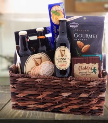 3 Bottles Of Dark European Beer 330 Ml Each (Guiness, Leffe, Or Similar) Gourmet Cheese Spread 105 Gr (Boursin Or Similar) Pack Of Gourmet Almonds Ultje , Cambrook 120 Gr Box Of Gourmet Crackers 200 Gr (Carr, Wasa, Bahlsen Or Similar) Gift Wrapped In A Basket With A Bow