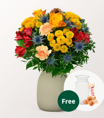 Harmonious flower bouquet with orange roses, blue thistles, orange santini balls, red alstromerie, orange carnations, cone, pistochia and salal. Diameter about 30 cm. Freshly tied for you with care tips, flower nutrients and supplied with water.