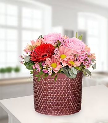 Gorgeous flower arrangement with 2 light pink roses "Heidi", 2 dark red germini "Maserati", 1 salmon chrysanthemums "Grand Cherry", light pink wax flowers, 2 eucalyptus and 3 pistochia in a modern ceramic pot (approx. 13,5cm). The flowers are fixed on a block of mosy. With nursing instructions.