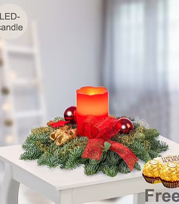 Inspiring arrangement with a red HI-LED candle (10 cm x 7,5 cm) batteries incl., decorative ribbon (approx. 80 cm), golden baby's breath, cinnamon sticks (8 cm), red felt stars (4 cm), golden Mini Pradep and shiny red Christmas balls (4 cm).