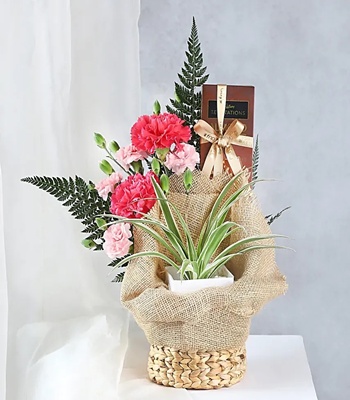 Handle the flower package with care so as not to damage the content inside it. Keep flowers and plants in a cool spot away from direct sunlight. Slow watering is preferred.