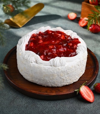 Strawberry vanilla cake with strawberry filling and rich white cream topping.