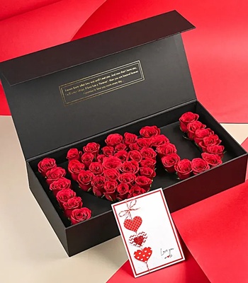 When you want to go big, here is the ultimate gift of love and adoration! Say those three magical words with an arrangement of premium red roses, set beautifully in a luxurious box. The perfect symbol of love and romance, this stunning box of roses is sure to make a lasting impression. The gift also carries a sweet message for the one your heart beats for in the form of a greeting card. Product Details: 45 premium quality, unscented red roses Black rectangular cardboard box (Dimensions: 20 x 10 x 4 inches) "Love Has No Language" greeting card