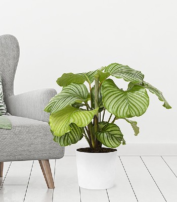 Calathea or basket marante is an ideal foliage decoration plant for any office or living room. The height is approx. 50-100cm. The leaves are green-white. The plant is not only decorative, but also healthy. It purifies the air and thus improves the indoor climate. The delivery height is approx. 30-50cm. Important: The plant is supplied in a culture pot. The illustrated planter is not included in the delivery