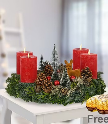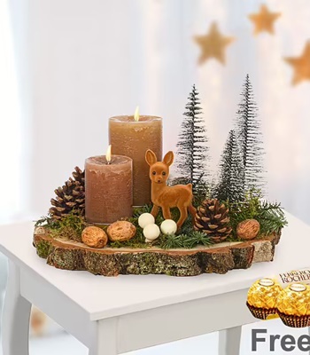 Sweet gift on a wooden slice (30cm) with 2 brown rustica candles (12x7cm and 9x6cm), with 2 golden coloured candle grommets decorated with nobilis, moss, 5 Amra Pod, 3 Pinus Sylvestris, 1 reindeer figur from Broekhof, 3 fir tree figures form Broekhof (2 trees 15cm and 1 tree 10cm) and 5 matt cream coloured christmas balls (2cm).