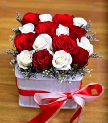 20 Stem Red and White Roses nicely arranged in a white ceramic vase with some fillers and greenery.