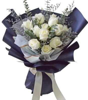 12 White Roses with Greenery Bouquet. Nature's purity and grace abound from this arrangement of velvety, white roses. Nestled in lush greenery, this bouquet will express your deepest wishes in spectacular fashion. Important: If this color rose is not available, then it would be replaced with the red color roses Your purchase includes a complimentary greeting card message.