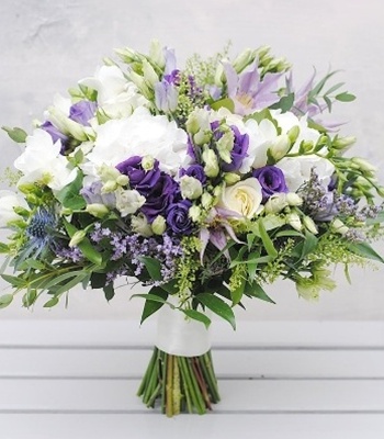 Express Your Deepest Condolences with our Funeral Bouquet, Comprising White Roses and Purple Flowers � A Graceful Tribute to Honor and Remember Loved Ones.
