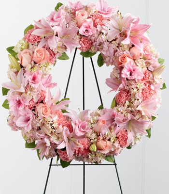 Express Your Sympathy from Afar with a Serene Funeral Wreath: White and Pink Flowers, Including Roses, to Convey Comforting Condolences