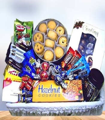 Extravagantly indulgent, this luscious chocolate gourmet basket comes bursting with chocolate bars, candies and cookies. Brand of chocolates may be substituted as per availability.