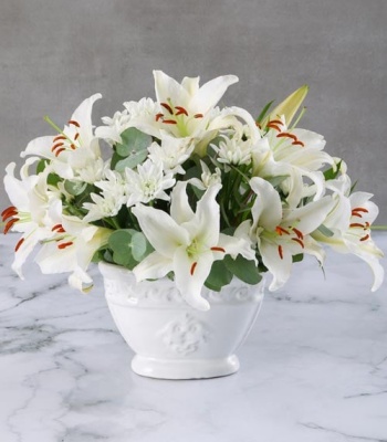 Arrangements & Bouquets of White Lilies or a white lily plant are usually associated with purity and heaven making them the flower of choice for funerals, condolence messages, or an accompaniment to a sympathy card.