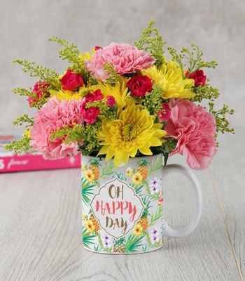 Have them singing your praises when you gift them this oh happy day mug arrangement. These colourful blooms are sure to brighten up their day even the gloomiest of days. In a white mug branded with a funky ‘oh happy day’ design is a gorgeous arrangement of mini red and pink carnations and yellow sprays. The small combo comes with delicious treats like Sally Williams nougat (50g), roasted chutney corn (100g), roasted peanuts (50g) and 3x chocolate gold stars in a gloss white hat box. The medium combo comes with Turkish apricots (100g), caramel peanuts (100g), roasted peanuts (50g), 3x chocolate gold stars and banana chips (100g). The large combo comes with Sally Williams nougat (50g), caramel peanuts (100g), roasted peanuts (50g), 6x chocolate gold stars and sliced beef biltong (80g). Order this oh happy day mug arrangement today and get sameday delivery with flowersgifting.