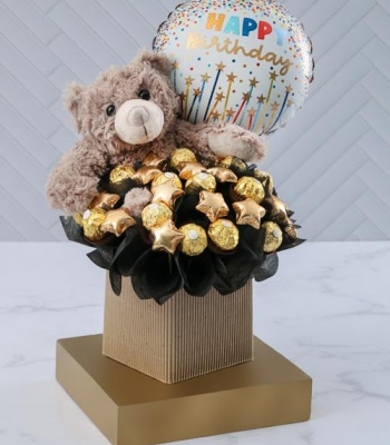 Turn their celebration into a chocolate oasis with the happy birthday teddy and chocolate gift. This is the perfect birthday gift to set a golden tone for the year ahead. This decadent assortment features 10 Ferrero Rocher single chocolates, 10 golden chocolate stars, a cuddly brown 22cm teddy bear and a festive 22cm “Happy Birthday” balloon. For a sweeter surprise, send the medium variant which adds a pack of Ferrero Rocher T16 chocolates to the first variant. For the ultimate surprise, send the large variant which adds J.C. Le Roux Le Domaine (750ml) to all the items in the medium variant. Each variant comes packaged in a charming bag with handles, sure to make their birthday sweeter.