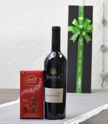 Looking to impress? Why not send this small gift complete with a bottle of Nederburg Baronne and a Lindt slab.