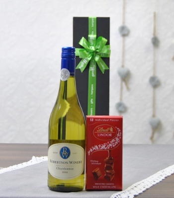 This black gift box is filled with a bottle of Robertson Chardonnay and a yummy Lindt Milk Slab.