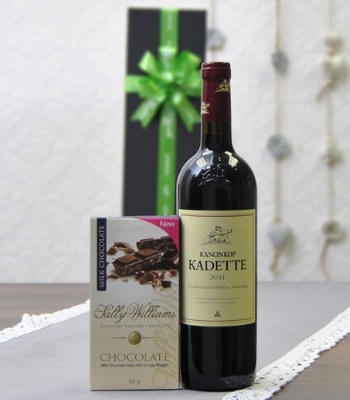 This gift comes complete with a bottle of Kanonkop Kadette and a Sally Williams Chocolate Nougat slab.