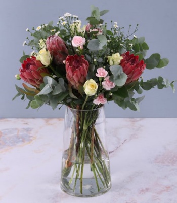 A Protea flower bouquet is a bold and exotic choice, symbolizing transformation, resilience, and beauty. With its striking appearance and unique shape, Protea adds a dramatic flair to any arrangement, making it perfect for special occasions or as a statement gift. Its vibrant colors and distinctive look represent strength and courage, making it a memorable floral offering.
