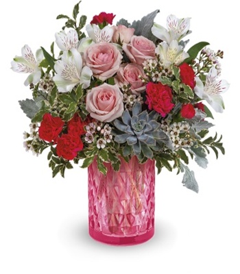 Make your feelings crystal clear with this beautiful pink rose bouquet presented in a sophisticated pink glass vase with delicate diamond pattern.