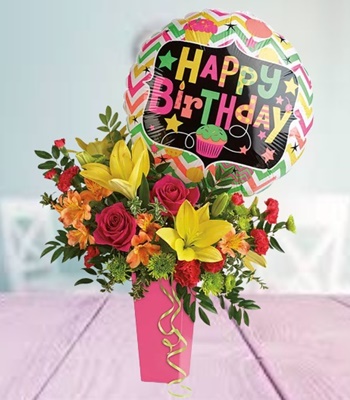 Send this vibrant and bold arrangement for her birthday this year! This show stopper is sure to be the talk of the office, and will definitely make this birthday, a birth-YAY! Approximately 19" W x 25" H. Includes: