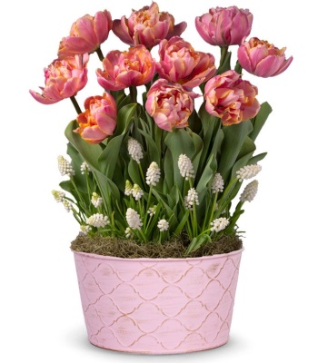 Brighten your space with this exquisite bulb garden, featuring vibrant double-blooming pink tulips complemented by delicate white grape hyacinths. Nestled in a charming pink, patterned pot, this floral arrangement promises to bring a breath of spring into your home or office. Perfect as a thoughtful gift or as a delightful centerpiece, it's a long-lasting expression of elegance and natural beauty.