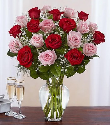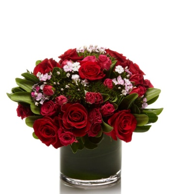 A traditional arrangement with a twist. Red roses mixed with soft pastel blooms and green dianthus arranged in a clear glass cylinder. Designed with the stylish Valentine in mind.